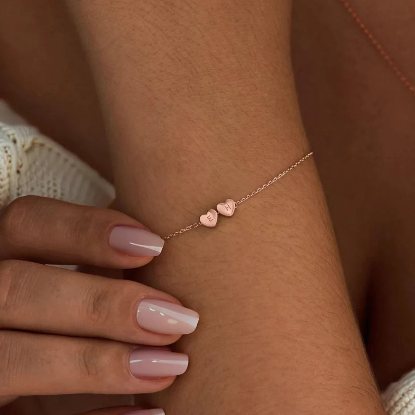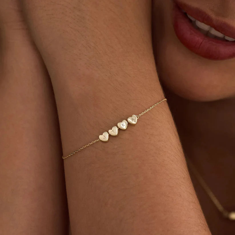 Roztomilý náramek s malými korálky ve tvaru srdíček, na kterých je písmeno dle vašeho výběru. Přidejte své iniciály nebo iniciály svých blízkých a vytvořte si tak jedinečný šperk jen pro vás.